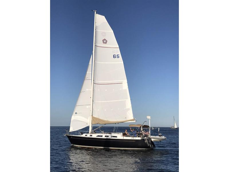 New Rolly Tasker sails 2019. Full batten flattop mainsail with Harken ball bearing Battcars and 2:1 Halyard. Camberspar self-tacking Jib. Two reef points with single-line reefing system lazy jacks and lazy bag (2019). Carbon fiber unstayed mast. Engine Updated 2005. Yanmar 40 hp (larger engine upgrade from the standard 27 hp). 2017 New 3 blade feathering Max Prop, ss shaft, cutlass bearing and Norscot dripless seal, engine mounts. Upgraded with multi-grove pulleys and serpentine belt. Swim Platform. Martek Davits and crane. Teak Wheel and cockpit table. 240 watts Solar Panels, 2-100 Amp Hour LiFePO4 House Batteries (2025). 2-Dual Purpose Starter Batteries. Large Bimini top and dodger. Cockpit cushions. Garmin/Nexus Echo Map Chart plotter UHD 64cv, wind, depth, log/speed, heading, and three repeaters. Raymarine Autopilot. Raytheon Radar. Uniden VHF with wireless remote, radio with CD, Bluetooth and 4 speakers. Xantrex Link 2000 battery interface and Xantrex Inverter/Charger. Windlass (Simson/Larence new motor 2019) with Manson Supreme anchor and 100 ft of chain. Teak interior with hot and cold water, refrigerator, propane gimbled stove with oven. Two aluminum propane. Ample storage. Head with hot and cold shower. 65-gal fresh water holding tank. 16-gal waste holding tank. Extra 35-gal fresh water holding tank dedicated to flush head (eliminates head odor!). 10-gal water heater which uses engine heat or electric. |