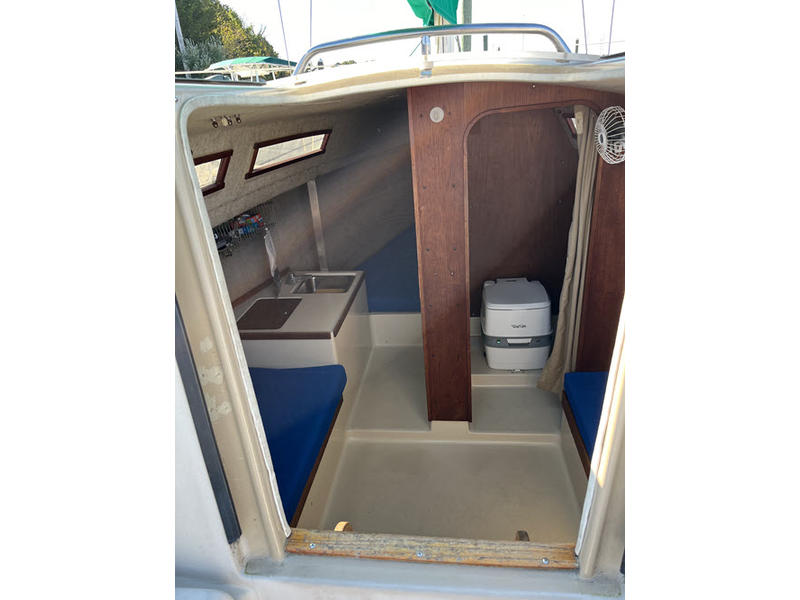 Excellent racer-cruiser with a comfortable cabin for day-sailing or overnighting. Fully enclosed head, new cushions and lots of storage. Features a retractable keel (daggerboard) that allows for a shallow draft when the keel is raised, making it trailerable and suitable for navigating shallow waters.