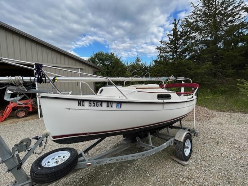2024 new mainsail from Com-Pac Yachts (never used); old mainsail (original?) is serviceable and setup for single line reefing with a downhaul line led aft to the cockpit. Boom vang.