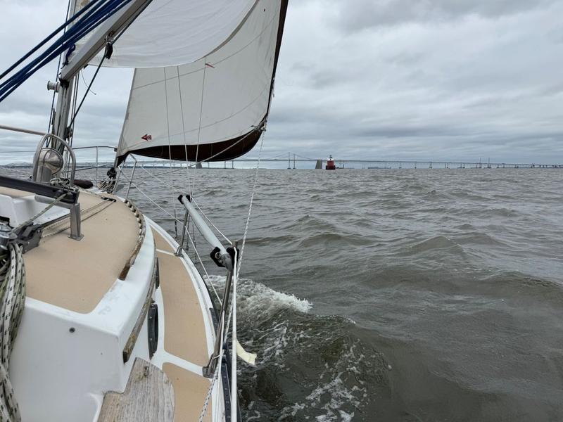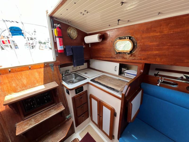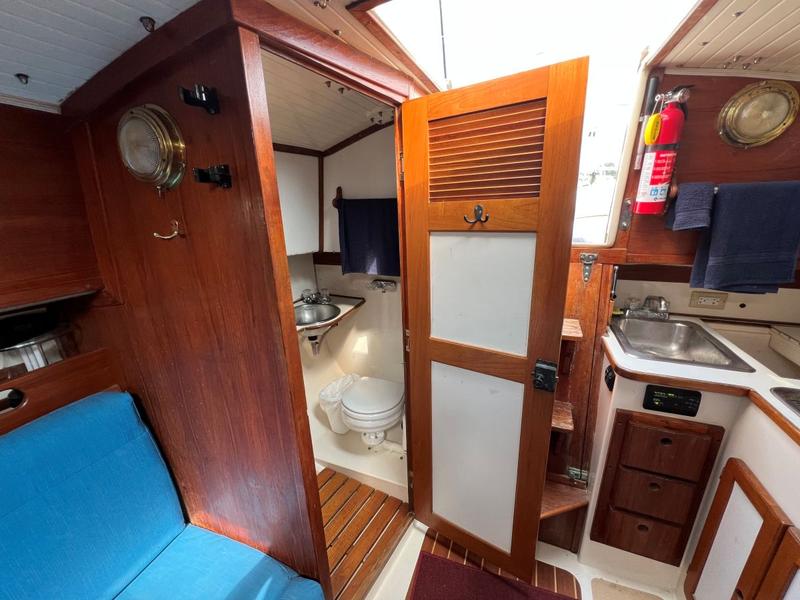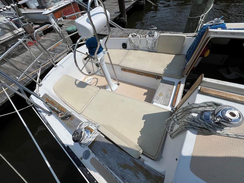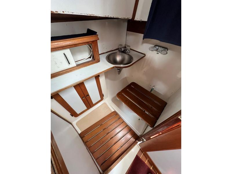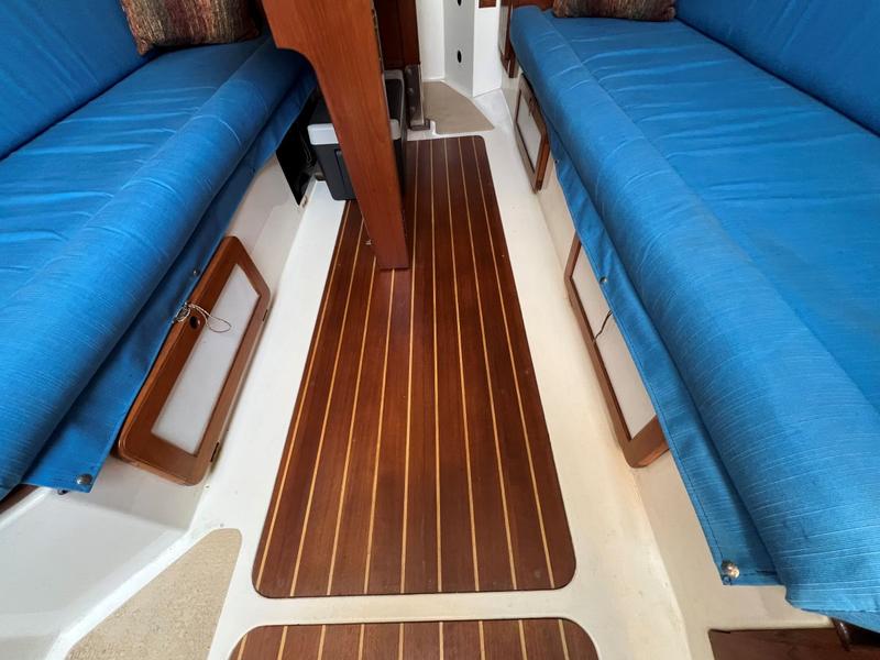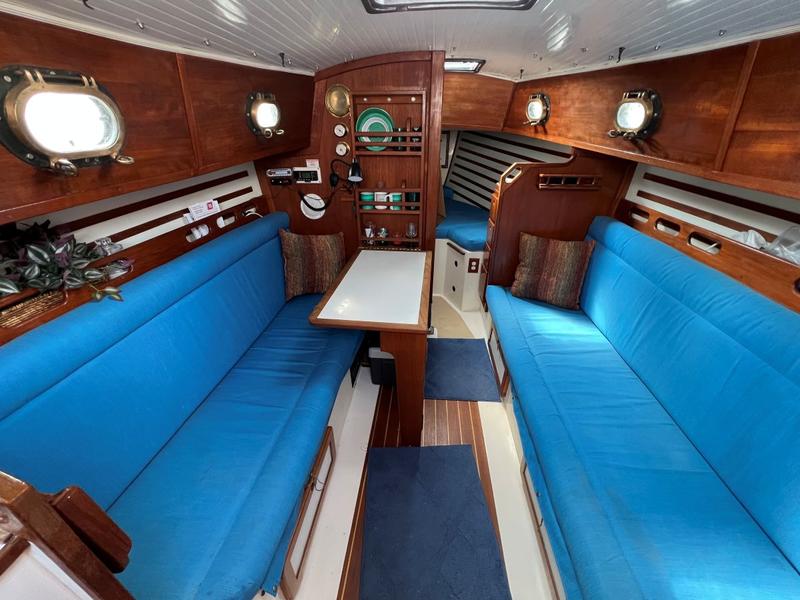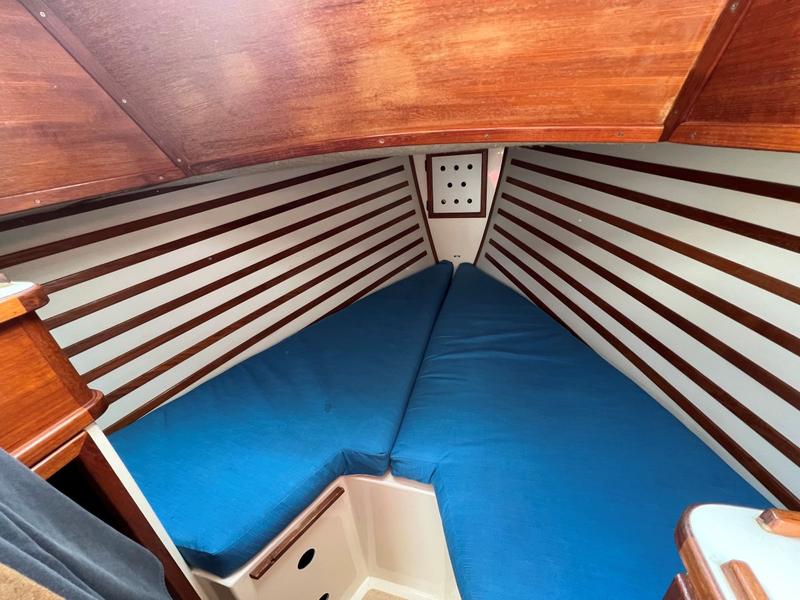 This is a boat of classic design and quality construction, ready to cruise. 8 Bronze opening portlights, 2 deck hatches, 2 dorade vents, teak bowsprit. Upgraded teak and holly sole, new interior cushions 4 years ago, drop-down cabin table. |