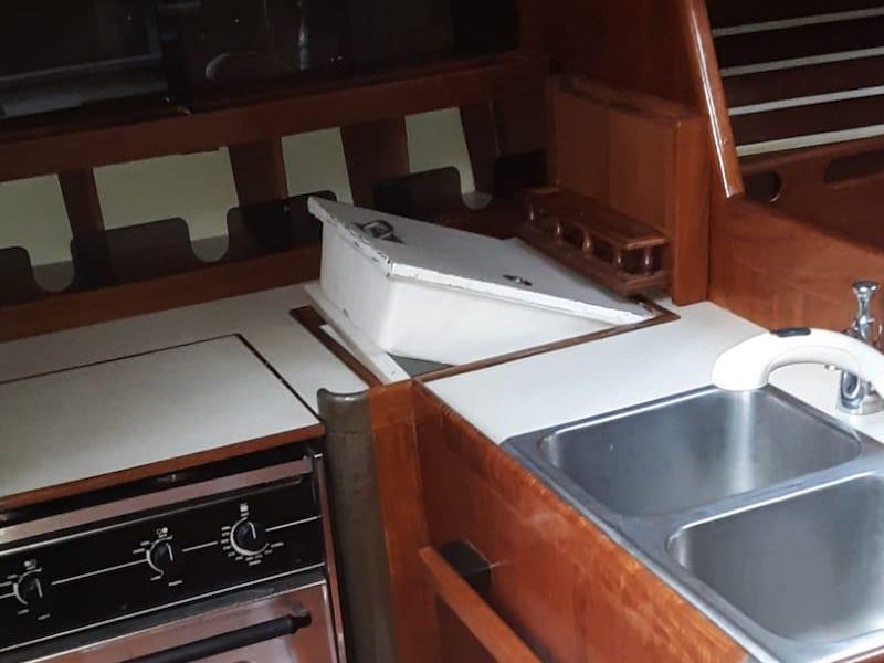 Interior Upgrades: Newly Reupholstered settees and mattresses. Inside teak sole, doors, cabinet fronts and doors and walls restored and treated with easy to maintain Waterlox oil Installed high efficiency 3.5 cf freezer and separate 3.5 cf refrigerator Replaced hot water heater 2 large aluminum propane tanks in a dedicated vented locker. Installed additional propane on demand hot water heater providing hot water when anchoring Heat pump HVAC 16,000 BTU with microprocessor soft start designed to work with Honda 2000i for HVAC at anchor. Quiet low energy fans in cabins Additional flip up work tables in the main cabin, galley and one aft cabin. New gimbaled stove Lee cloths added to both port and starboard main cabin settees Insulation and cleanable upholstery on walls of V Berth. Under mattress ventilation Insulation added under the new fiberglass ceiling boards Privacy curtains throughout Mosquito screens Removable security bars for the 2 main hatches and companionway (allows airflow with security)